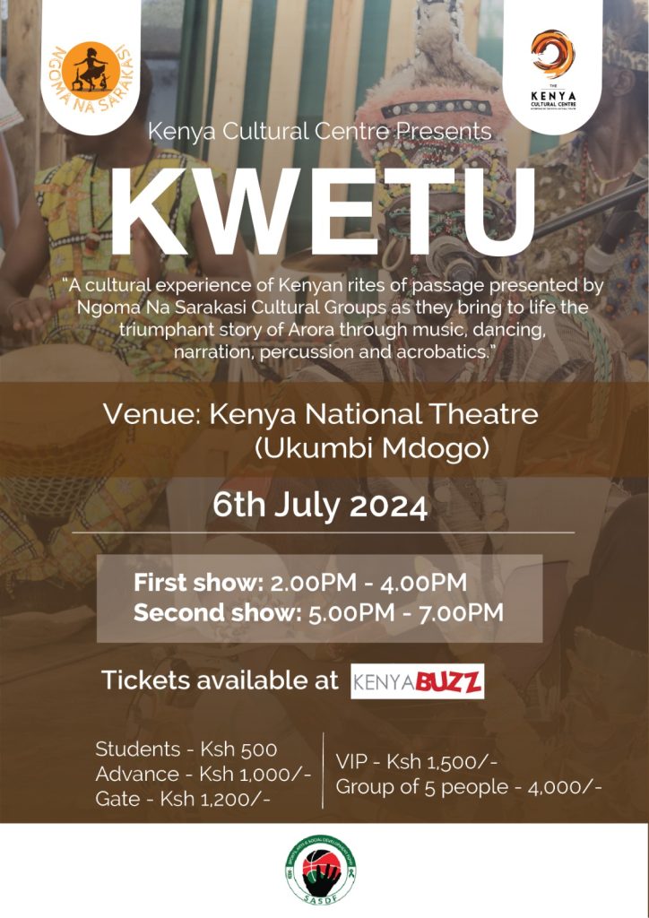 “KWETU” on 6th July 2024. We will have a 2pm and 4pm show. Tickets can be purchased conveniently through Kenya Buzz: https://kenyabuzz.com/events/event/kwetu