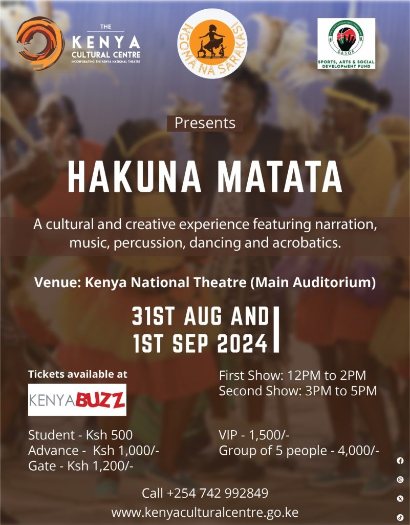 As part of the ‘Ngoma Na Sarakasi’ program, which celebrates and promotes Kenya’s rich cultural heritage through music, percussion, dance, and acrobatics, we invite you to the Kenya National Theatre for a spectacular performance of Hakuna Matata. The show will happen on 31st August and 1st September 2024 at 12pm and 3pm.